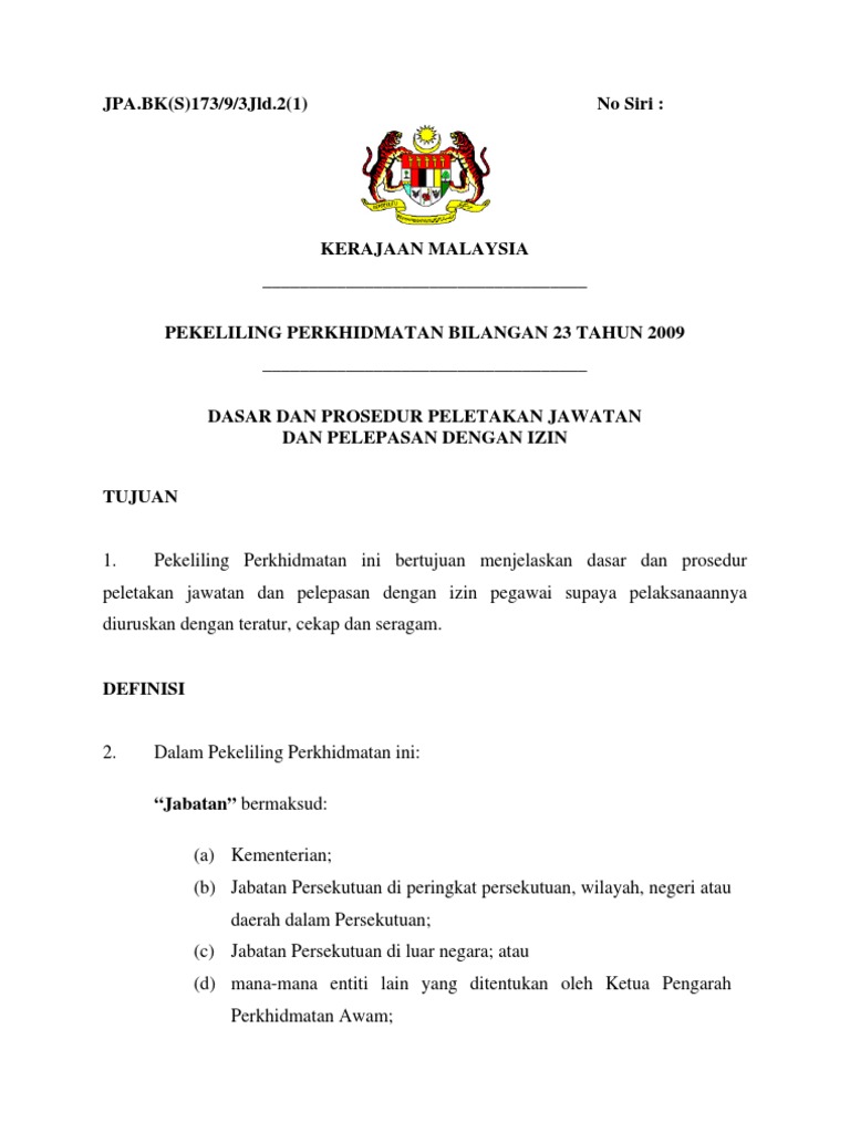 Surat pekeliling perkhidmatan ini bertujuan memaklumkan dasar dan prosedur mengenai pelepasan jawatan dan peletakan jawatan selaras dengan hasrat kerajaan untuk memberi ruang mobiliti kepada pegawai dalam perkhidmatan. Ia merupakan contoh bagi semua jenis surat formal perletakan jawatan. Oleh itu apa juga sebab kamu berhenti kerja JANGAN membuat sebarang kenyataan negatif mengenai bekas majikan syarikat polisi syarikat jabatan lain atau rakan sekerja dalam surat letak jawatan.